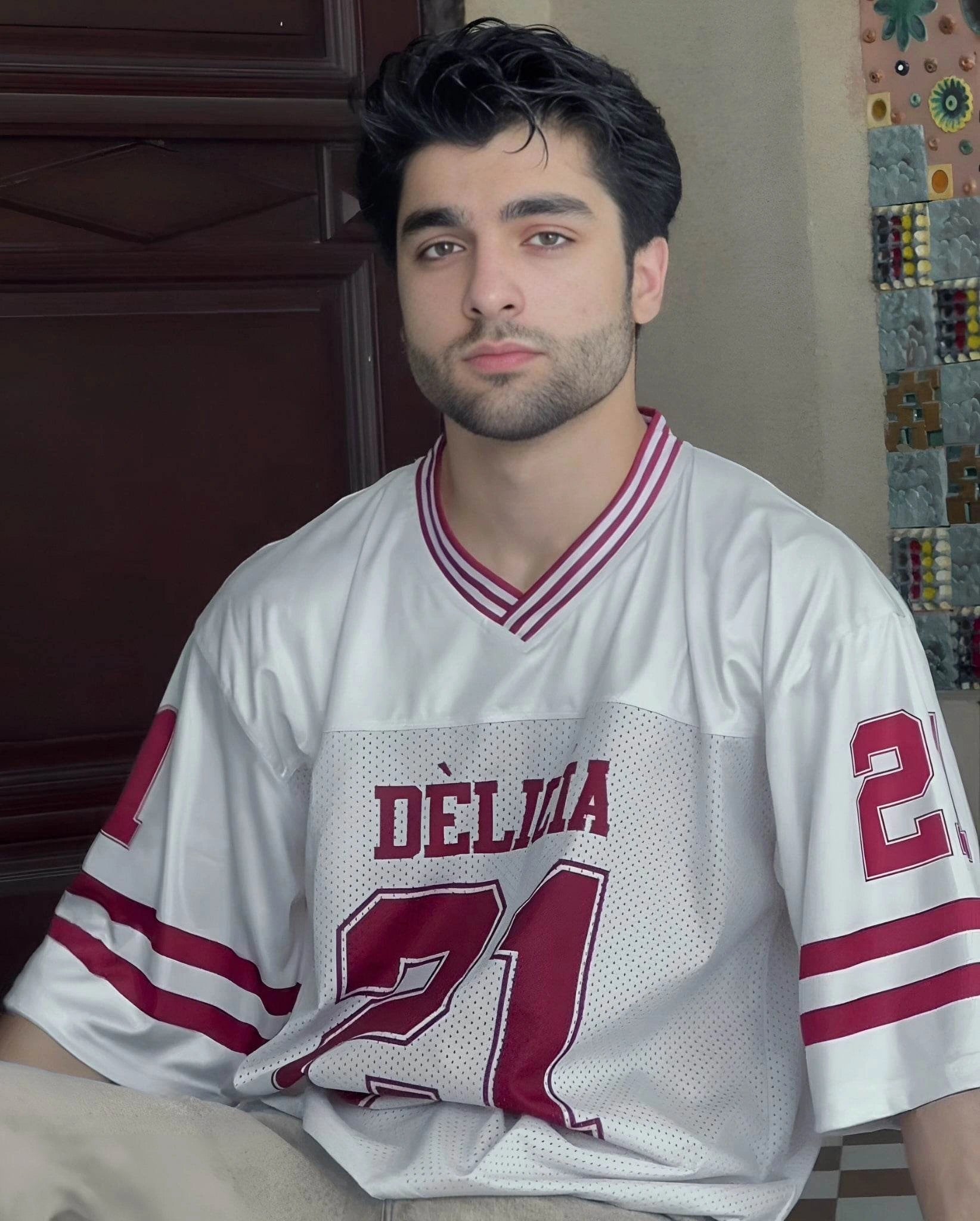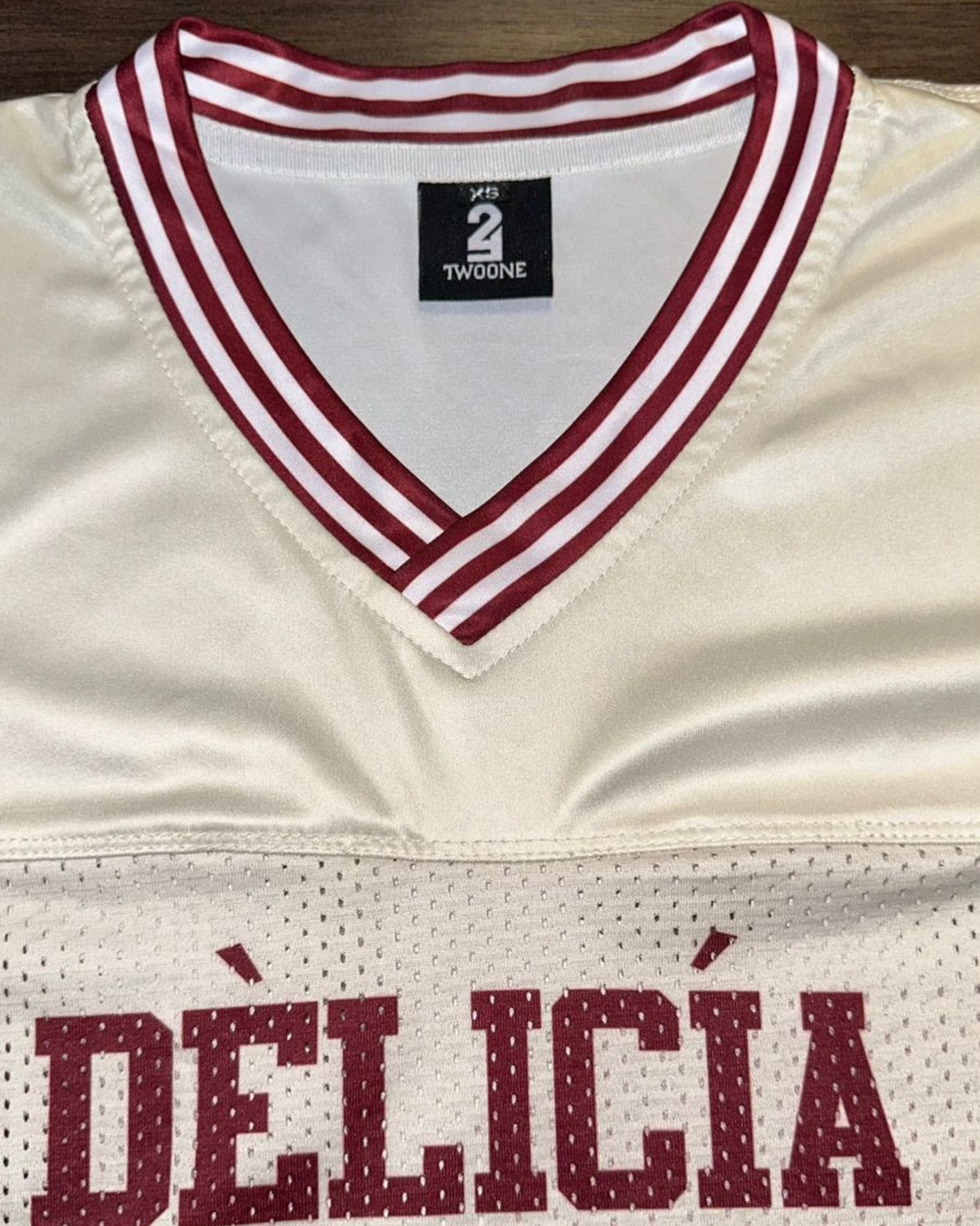 Featuring breathable mesh fabric, a classic V-neckline, and maroon varsity stripes, the jersey is dominated by the standout “21” print and our signature Delícia front graphic—celebrating flavor, flair, and fearless individuality.